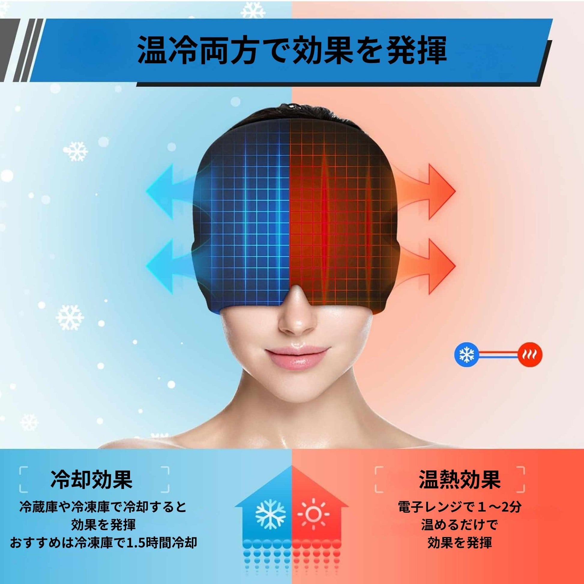 冷却はもちろん、温めても使用可能。日中の片頭痛にも、夜のリラックスタイムにも。